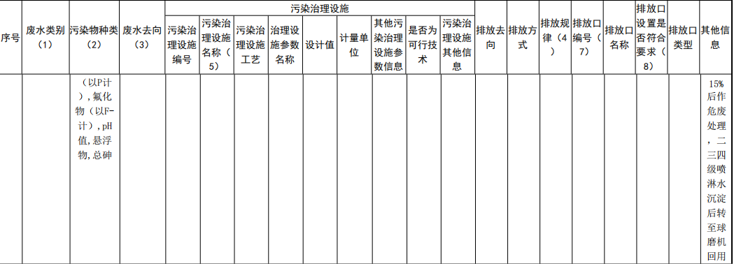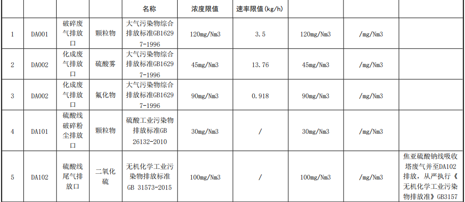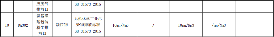 湖北龍祥磷化有限公司環(huán)境信息公示 湖北龍祥磷化有限公司,現(xiàn)有10萬(wàn)噸/年過(guò)磷酸鈣生產(chǎn)線、20萬(wàn)噸硫鐵礦制酸生產(chǎn)線、2萬(wàn)噸/年氨基磺酸生產(chǎn)線(試生產(chǎn)階段)各一條(焦亞硫酸鈉生產(chǎn)線建成未生產(chǎn)),公司統(tǒng)一社會(huì)信用代碼:91420684726129188X,排污許可證編號(hào):91420684726129188X001Q,公司2022年主要污染物為:顆粒物、二氧化硫、其他特種污染物(硫酸霧、氟化物,氨(氨氣))、COD、氨氮其他特征污染物(硫化物,氟化物(以F-計(jì)),總砷,總鉛,總氮(以N計(jì)),總磷以(以P計(jì)),PH值,懸浮物)。公司自建成以來(lái)秉承著環(huán)保大于一切的理念,嚴(yán)格遵守國(guó)家相關(guān)法律法規(guī),主動(dòng)增強(qiáng)、改善相關(guān)環(huán)保治理與預(yù)防設(shè)施,未發(fā)生超標(biāo)排放情況?,F(xiàn)將公司主要污染物的名稱、排放方式、排放濃度和總量,以及防治污染設(shè)施的建設(shè)和運(yùn)行情況,危廢相關(guān)信息公示如下: